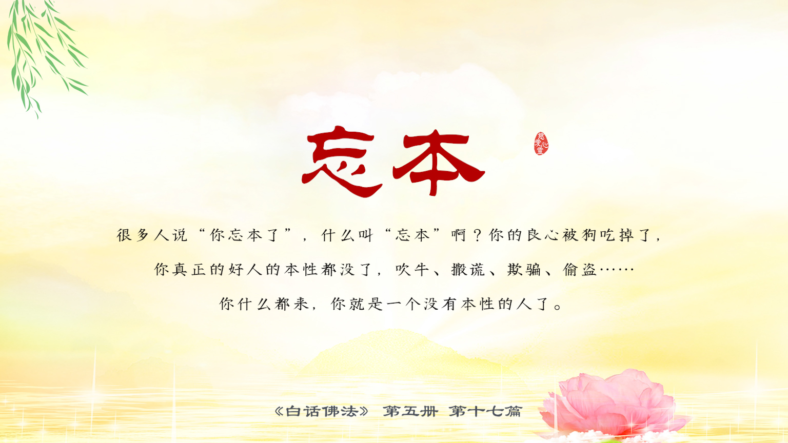 很多人说“你忘本了”,什么叫“忘本”啊?你的良心被狗吃掉了,你真正的好人的本性都没了,吹牛、撒谎、欺骗、偷盗……你什么都来,你就是一个没有本性的人了。
