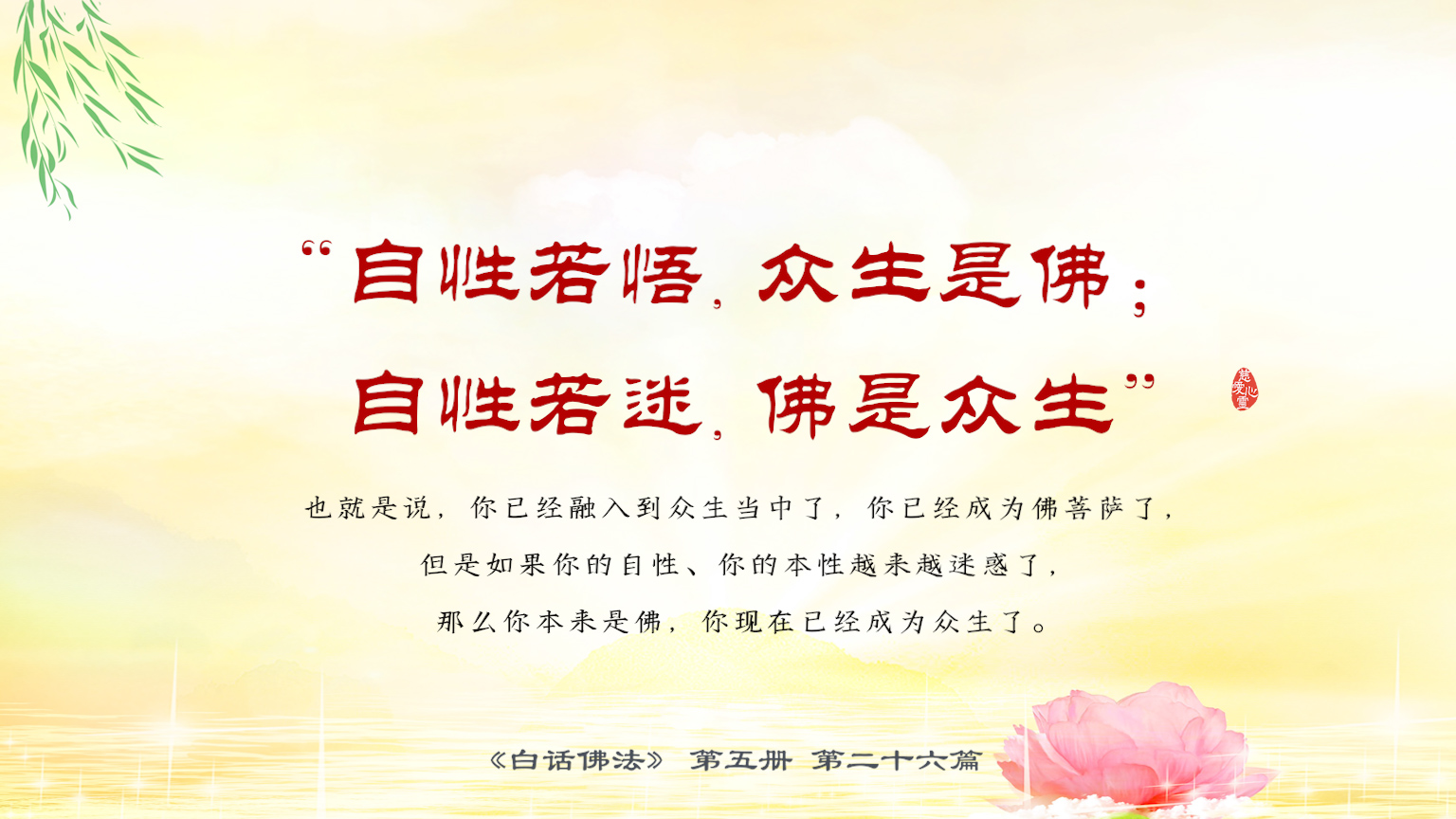“自性若悟,众生是佛;自性若迷,佛是众生”。也就是说,你已经融入到众生当中了,你已经成为佛菩萨了,但是如果你的自性、你的本性越来越迷惑了,那么你本来是佛,你现在已经成为众生了。